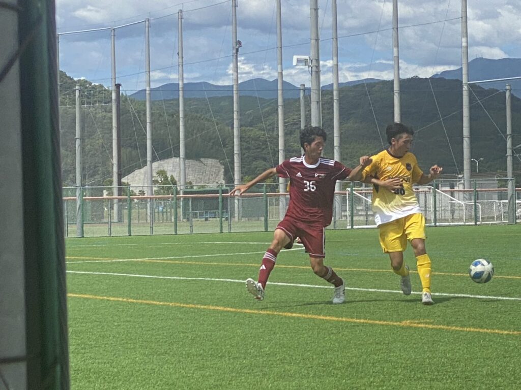 猛暑の中行われた立命館宇治(京都)との対戦は、4分に65/古内③がプレッシングで相手GKからボールを奪って決め、幸先良く先制します。その後はなかなか効果的にボールを保持できず、追加点を奪うことができません。18分、守備の対応の遅れから中央を崩されて失点し、1-1に追いつかれて前半を折り返します。