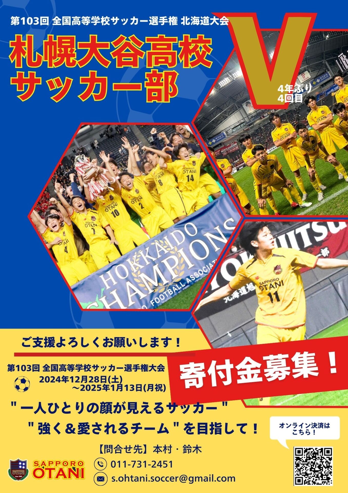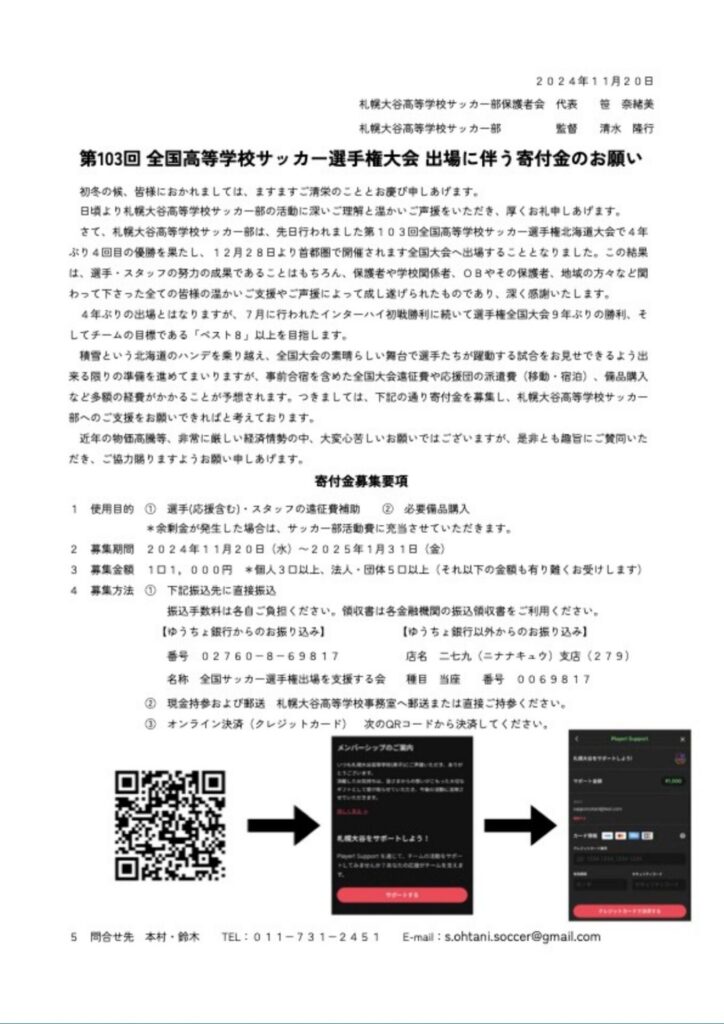 また、引き続き、寄付金を募集しております。札幌大谷高等学校サッカー部へのご支援をお願いできれば大変助かります。近年の物価高騰等、非常に厳しい経済情勢の中、大変心苦しいお願いではございますが、是非とも趣旨にご賛同いただき、ご協力くださいますようお願いいたします。