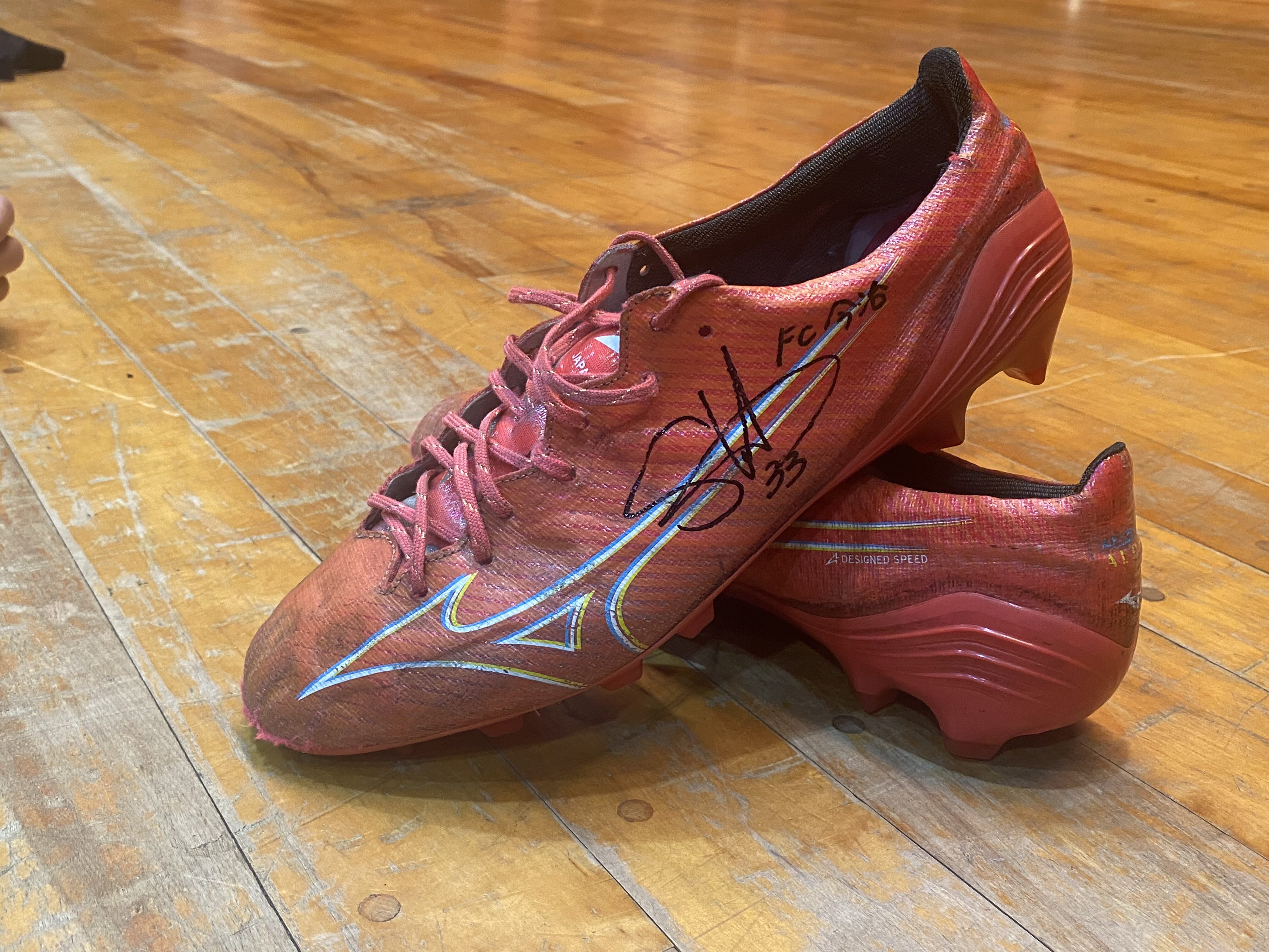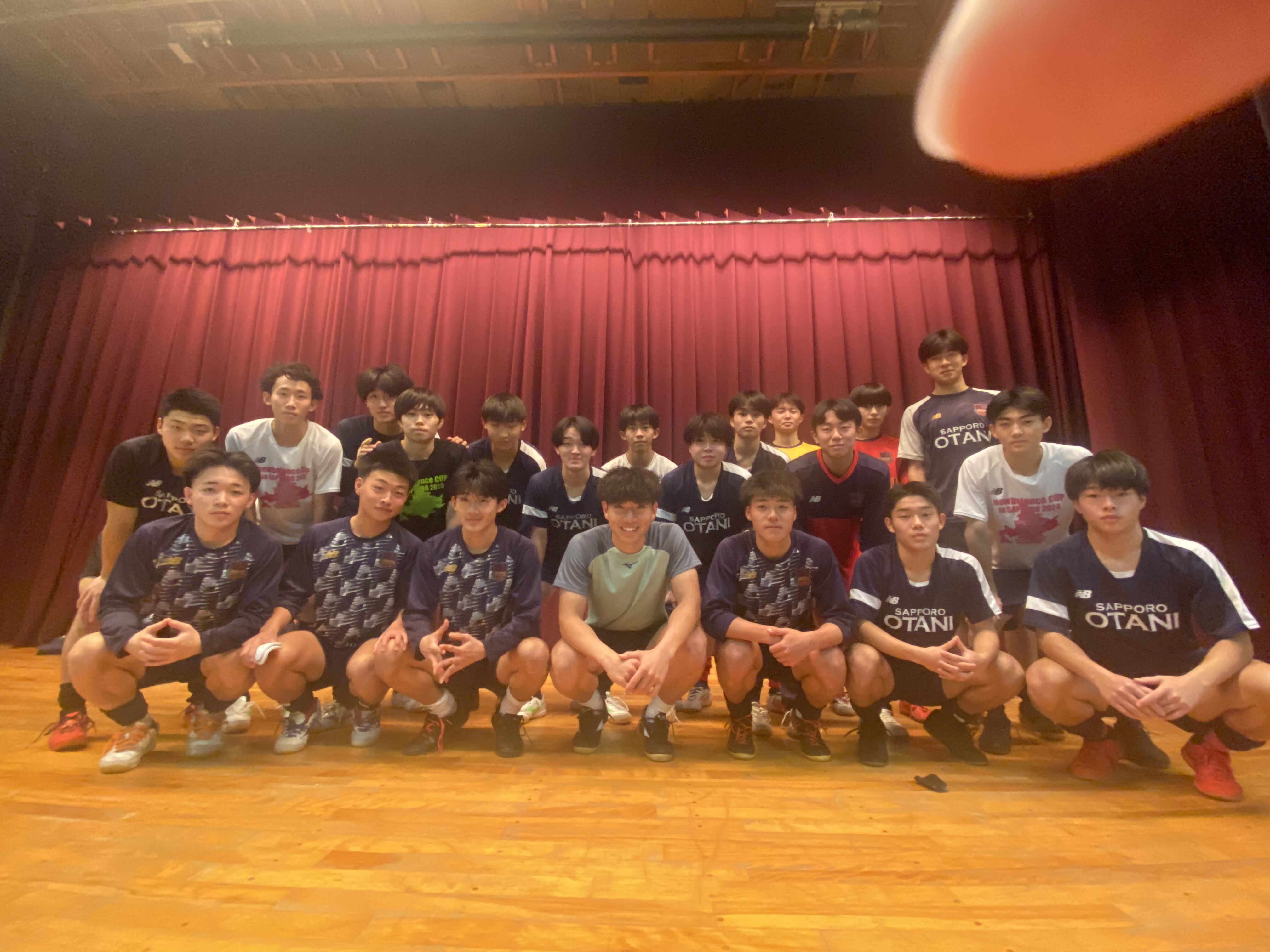 2026シーズンに向けての活動にOBのFC今治・笹修大が参加しています。23日(火)はTop teamの練習に参加し、1・2年生に大きな刺激を与えてくれました。また、シーズン中に使用したシューズ(サイン入り)を贈呈していただきましたので、丘珠スタッフルームに飾ります。