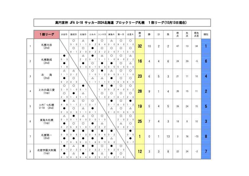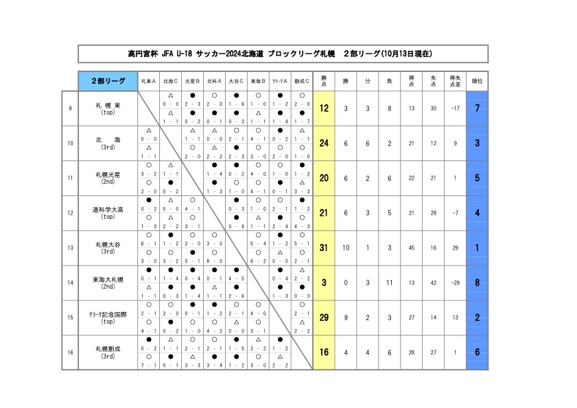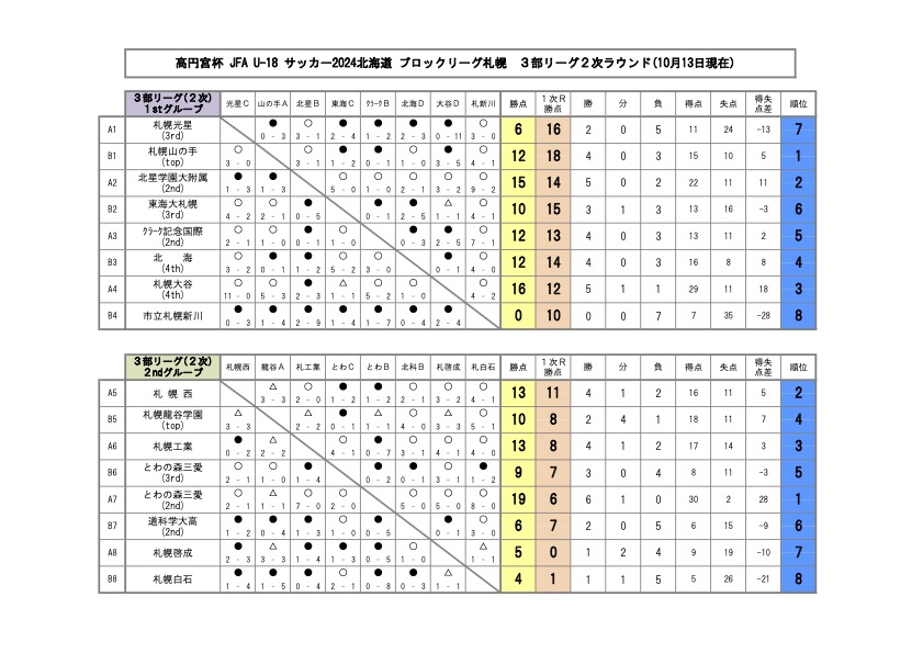 高円宮杯U18 ブロックリーグ2024札幌 第9節(延期分)・結果