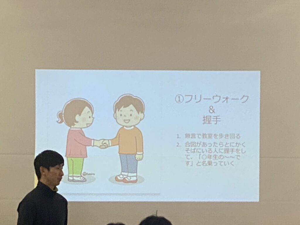 無言で教室を歩き回り、合図があったら近くにいる人と握手をして、お互いに名乗る。