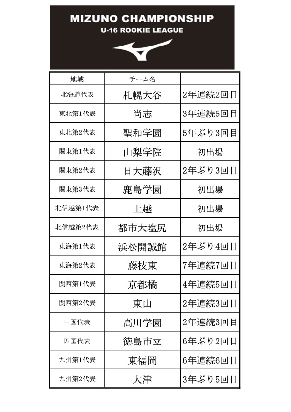 12月16日(土)〜18日(月)に静岡県時之栖で開催されるルーキーリーグの全国大会【2023 MIZUNO CHAMPIONSHIP U16】の組合せが決まりました。