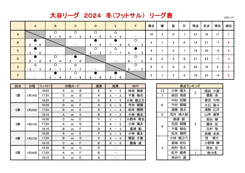 大谷リーグ 2024 冬 第4節・結果