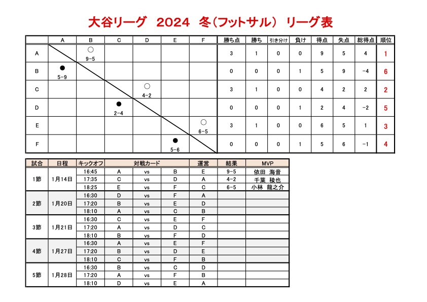 大谷リーグ 2024 冬 第1節・結果