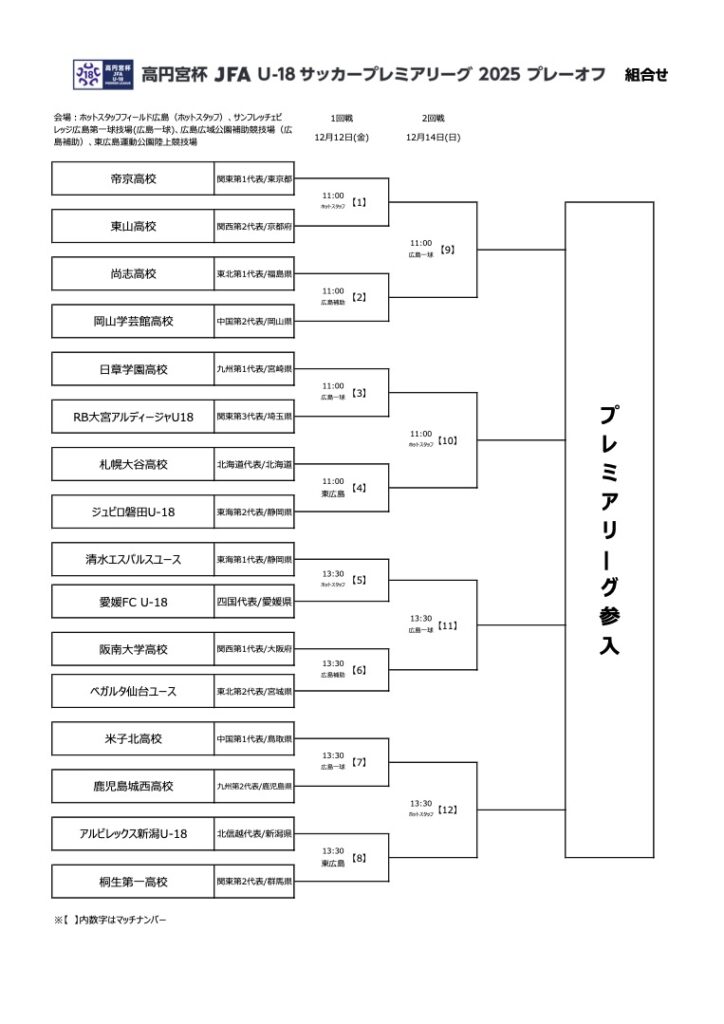 12月12日(金)から広島県で開催される【高円宮杯 JFA U18 サッカー プレミアリーグ2025プレーオフ】の組合せが決まりました。