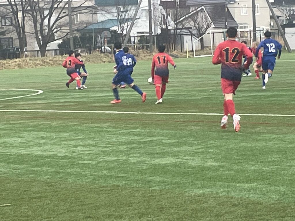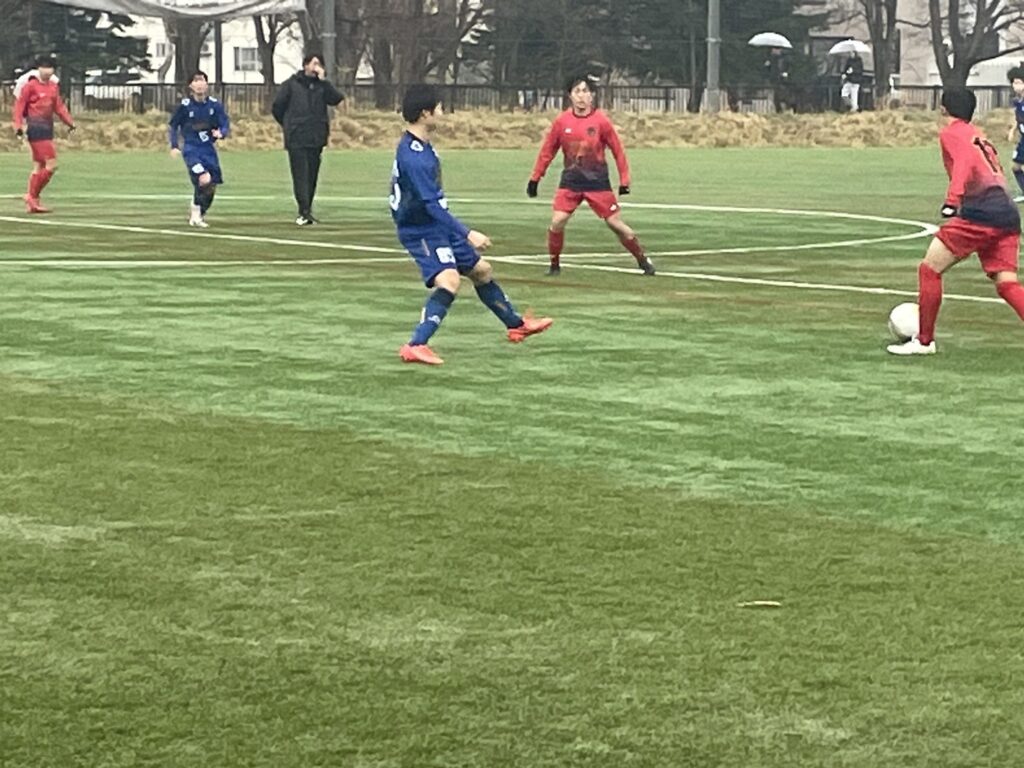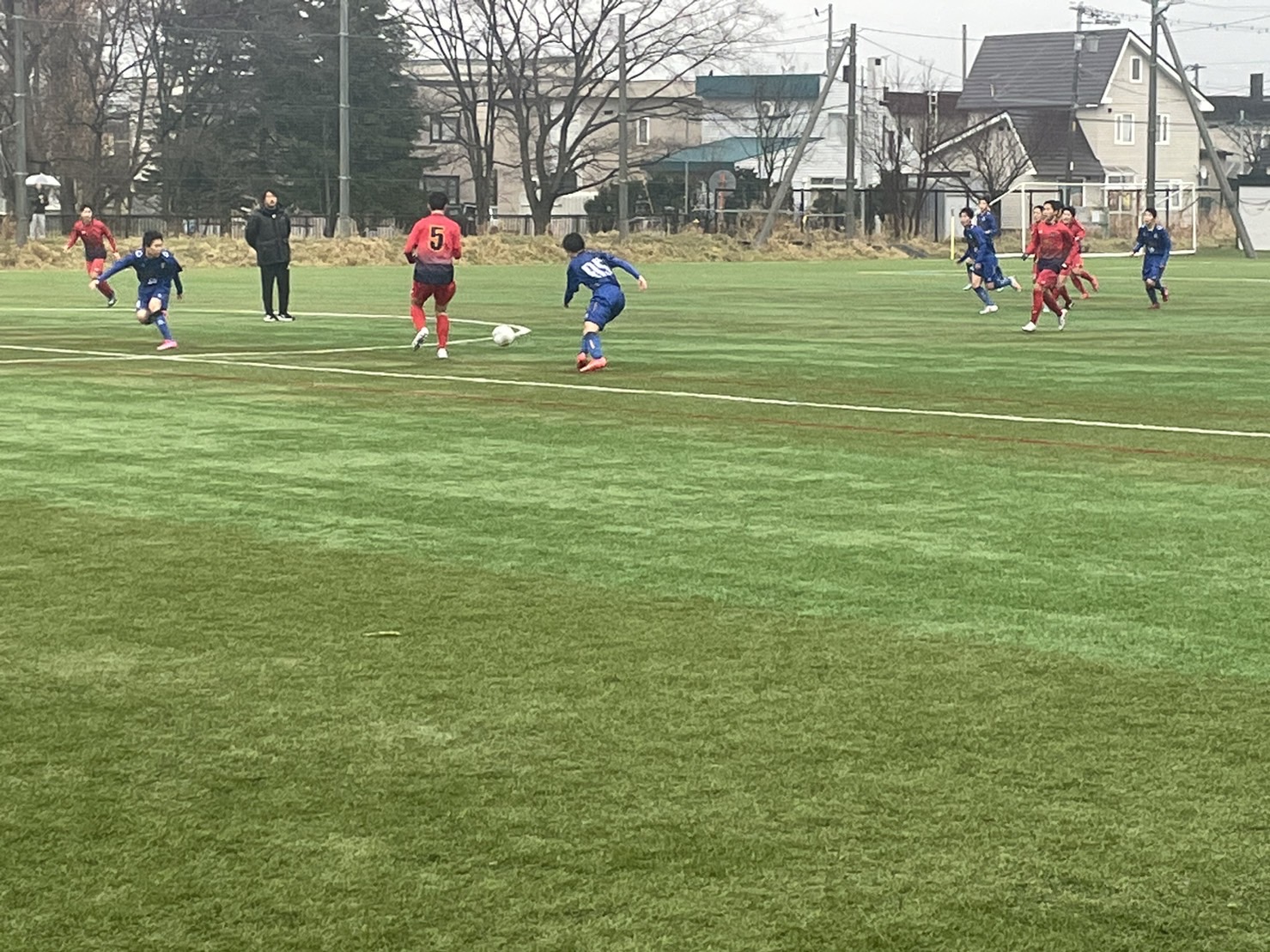 一度は一面雪に覆われた丘珠グラウンドでしたが、気温の上昇によりフルピッチで試合ができる状況になりました。1本目はサポートの距離感も良く、終始ボールを保持する展開となりましたが、決定力に課題を残しました。2本目以降は得点できたものの、効果的なボールの動かし方ができない印象でした。1週間後に控えるMIZUNO杯(ルーキーリーグ全国)に向けて、課題を修正します。